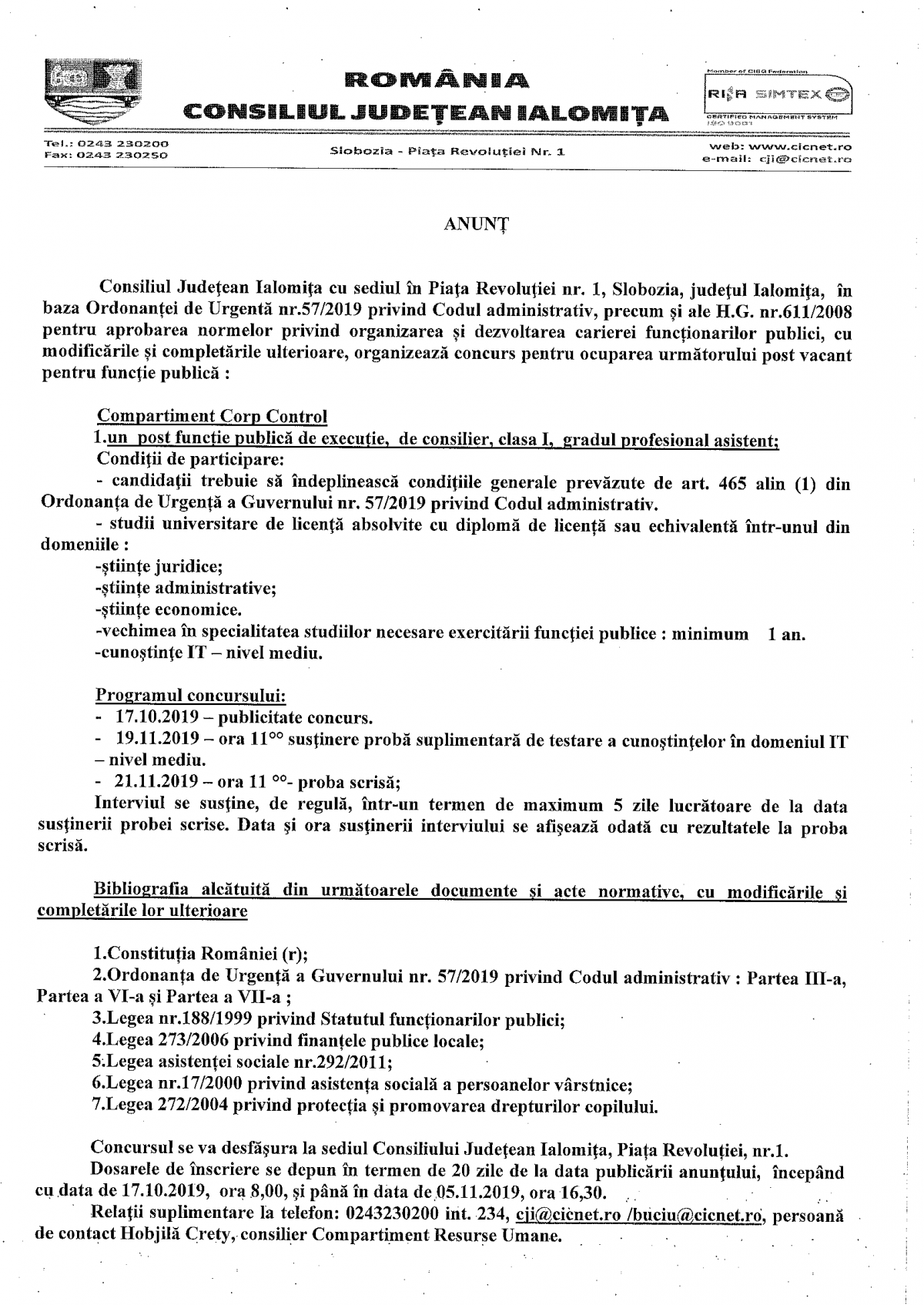 Anunț concurs ocupare post consilier asistent - Comp. Corp Control