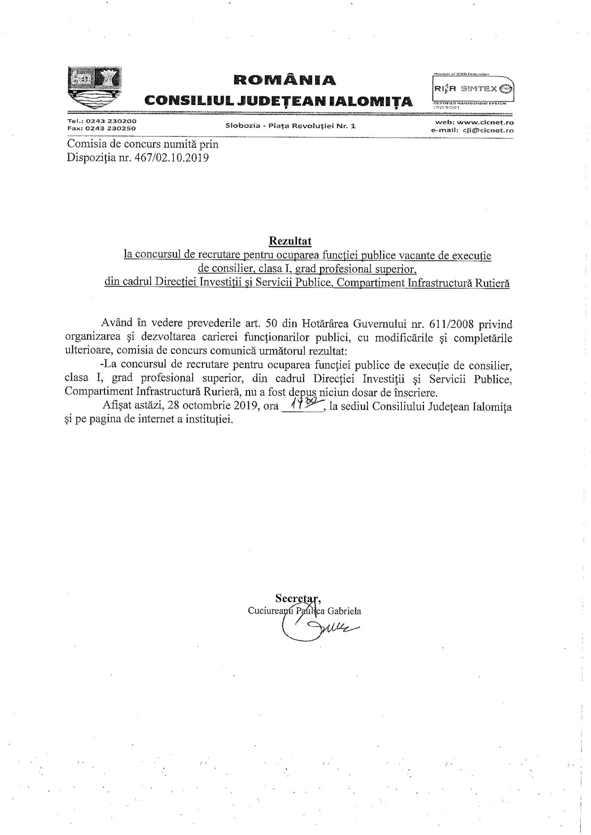 Rezultat la concursul de recrutare pentru ocuparea functiei publice vacante de executie de consilier, clasa I, grad profesional superior din cadrul DISP - Compartiment Infrastructura Rutiera
