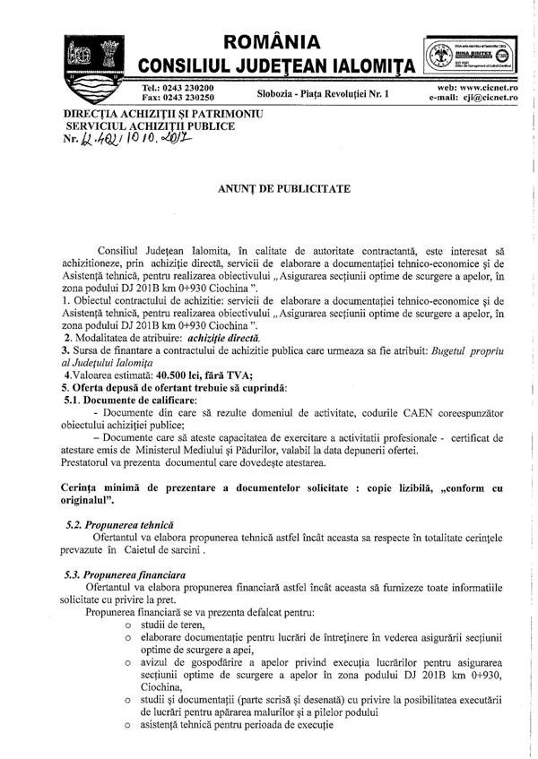 Anunț achiziție directă servicii elaborare documentației tehnico- economice si asistenta tehnica ”Asigurarea secțiunii optime de scurgere a apelor în zona podului DJ 201 B km 0+930 Ciochina”