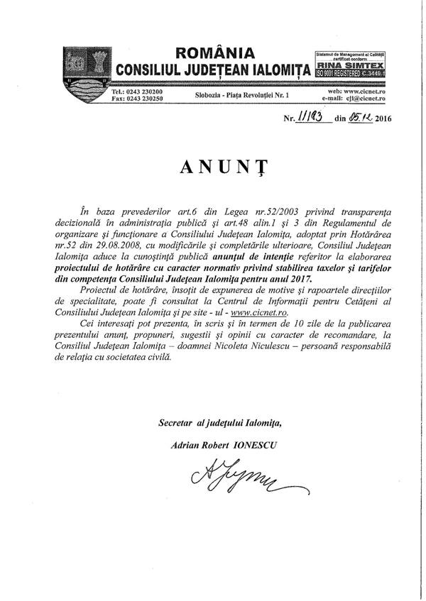 Proiect hotărâre cu caracter normativ privind stabilirea taxelor si tarifelor din competenţa CJI pentru 2017