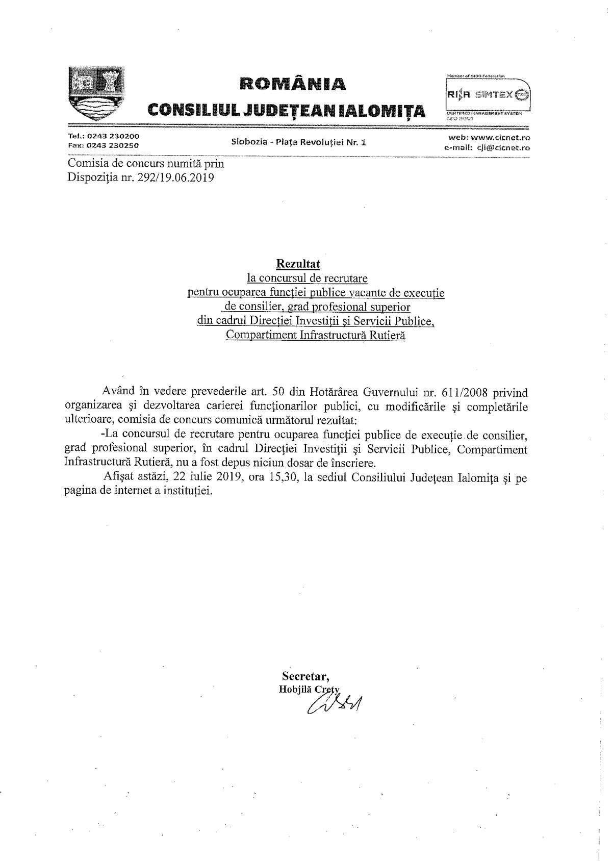Rezultat concurs ocupare funcție publică de execuție de consilier superior - DISP -Comp. Infrastructură Rutieră