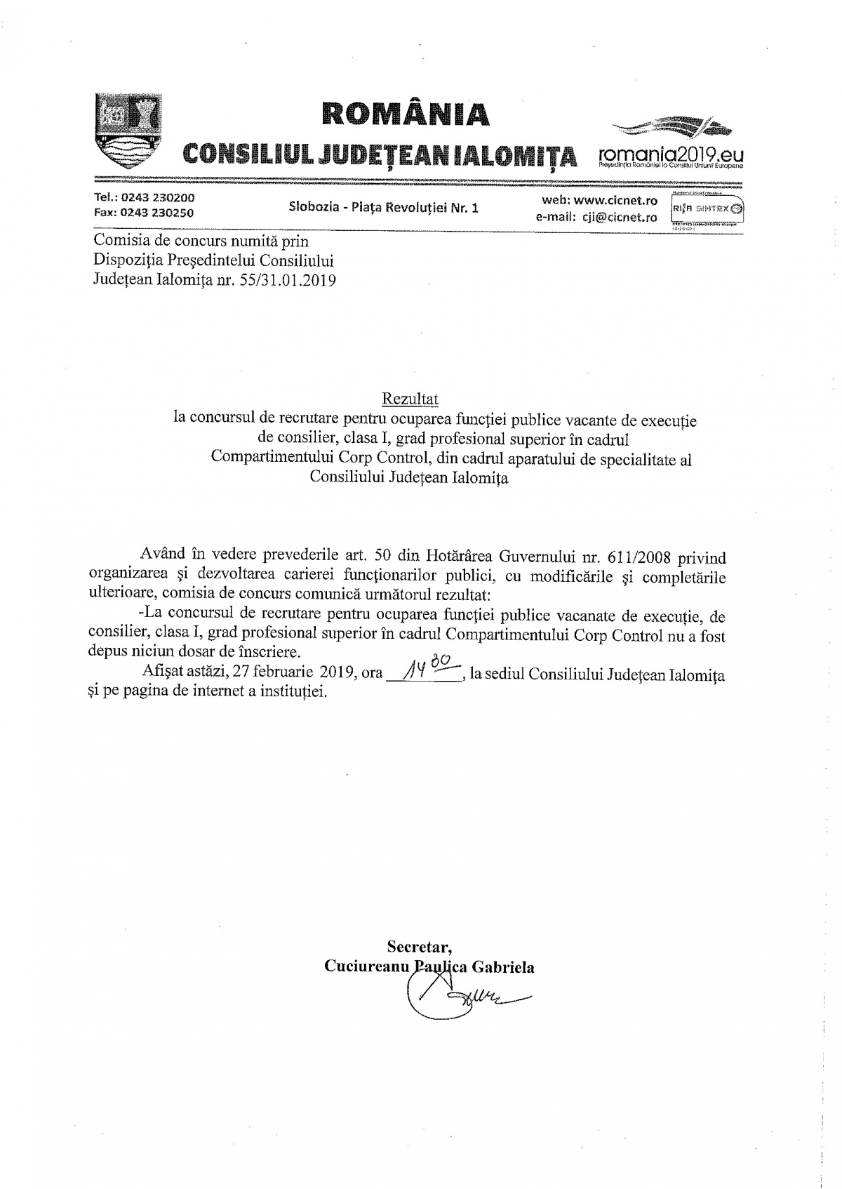 Rezultat concurs ocupare functie publica de executie conslier superior - Comp. Corp Control