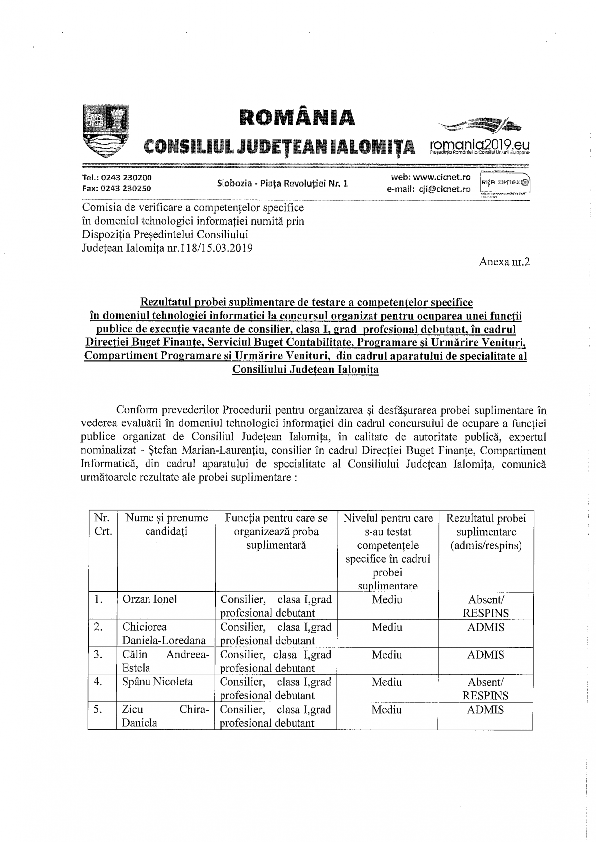 Rezultat probă suplimentare testare competențe tehnologia informatiei la concursul pentru ocuparea funcției de execuție, clasa I, grad debutant în cadrul Direcției Buget Finanțe