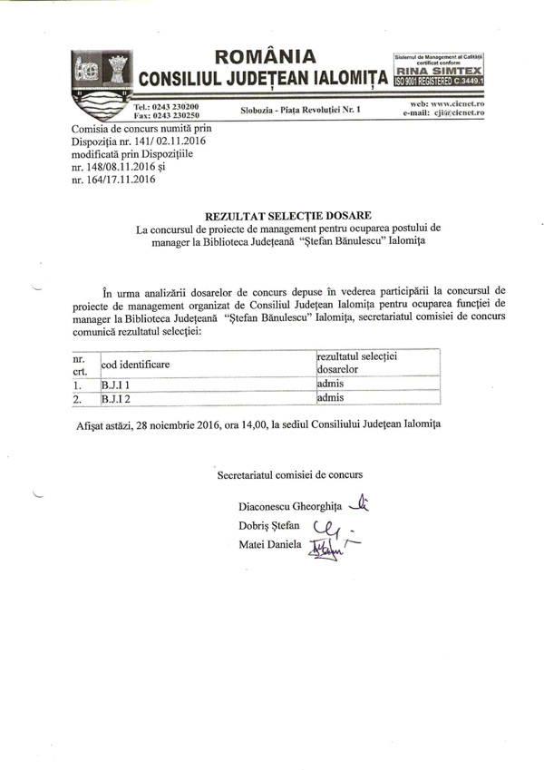 Rezultat selecție dosare concurs de proiecte de management pentru ocupare post manager Biblioteca Județeana Ștefan Bănulescu Ialomița