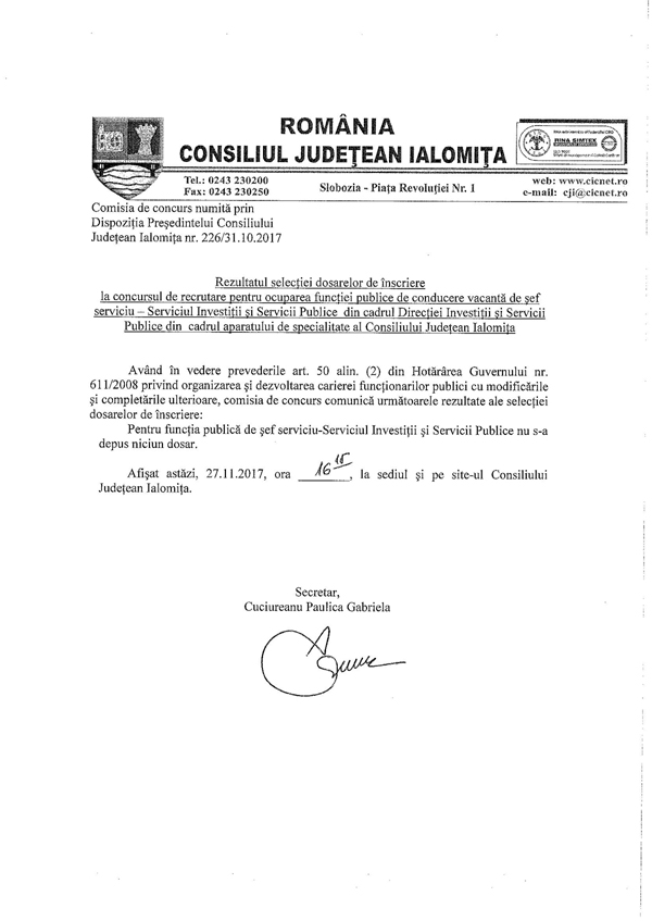 Rezultat selecție dosare înscriere concurs recrutare ocupare funcție șef serviciu - DISP