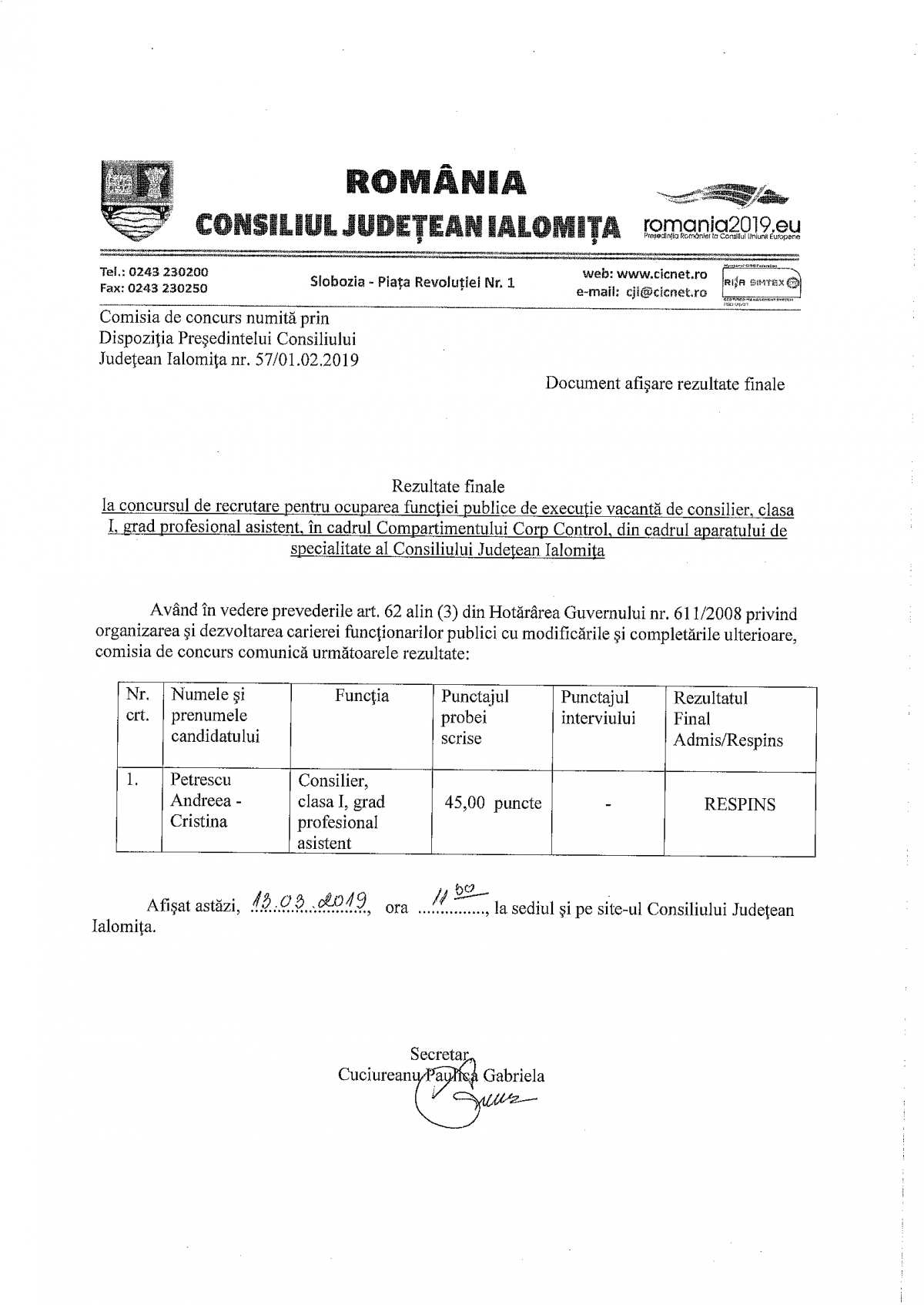 Rezultate finale concurs ocupare functie publica de executie consilier asistent, Comp. Corp Control
