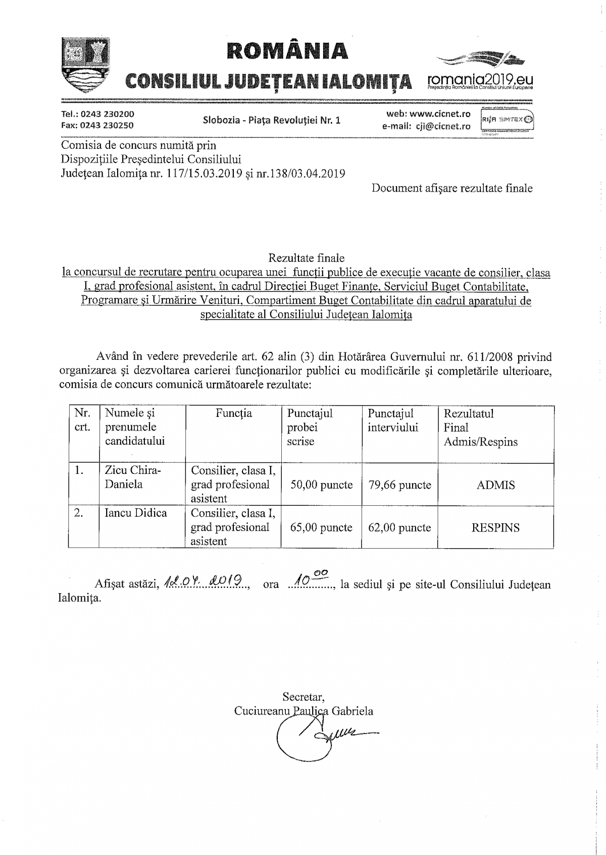 Rezultate finale concurs ocupare funcție publică de execuție de consilier , asistent - DBF