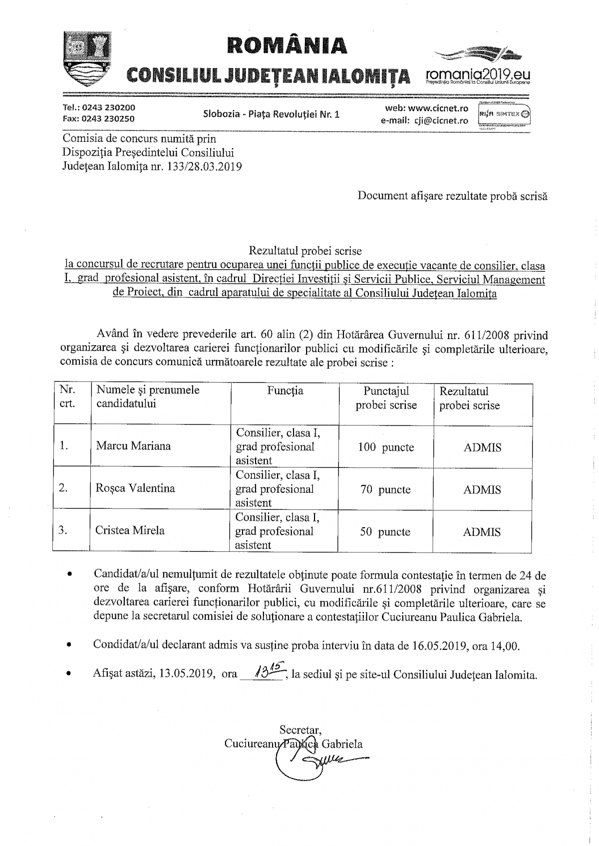 Rezultatul probei scrise la concursul de recrutare pentru ocupare funcție publice de execuție vacante de consilier clasa I, grad asistent. in cadrul DISP - Serv. Management de Proiect