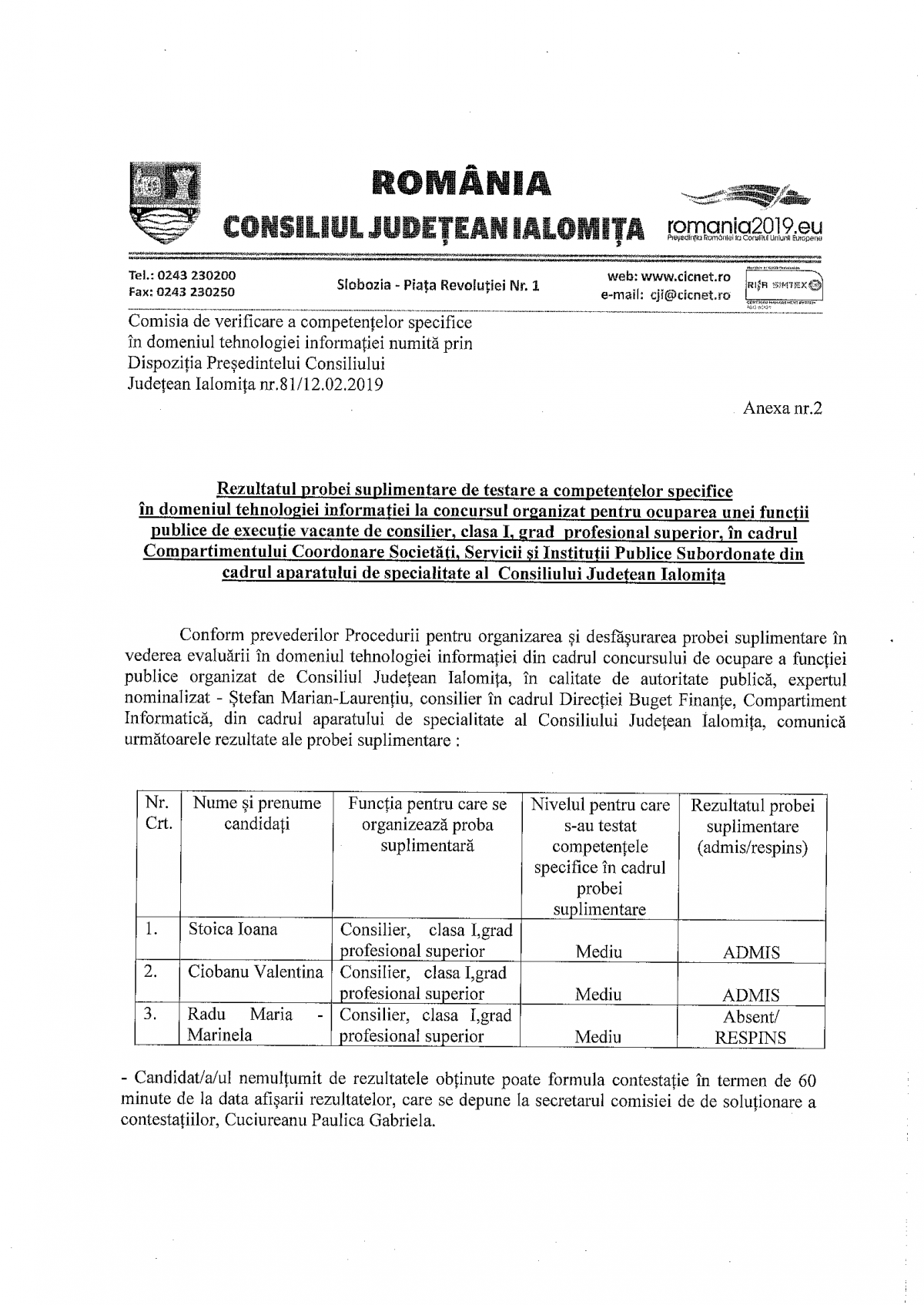 Rezultatul probei suplimentare de testarea competentelor specifice in domeniul IT - concurs - consilier, clasa I, grad profesional superior - Compartiment Coordonare Societati