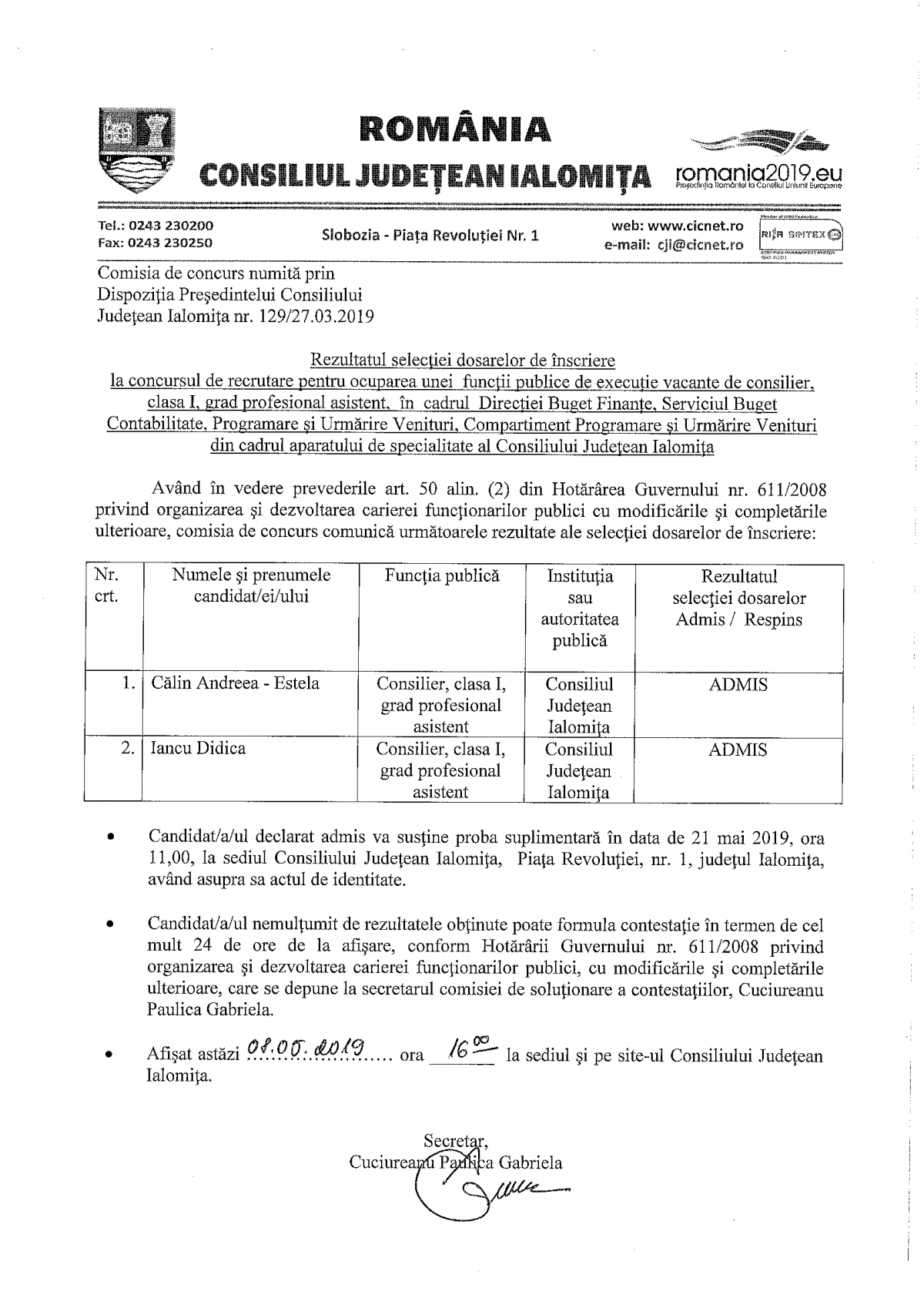 Rezultatul selecției dosarelor de inscriere la concurs ocupare funcție publică de execuție de consilier asistent DBF - Comp. Programare si Urmarire Venituri