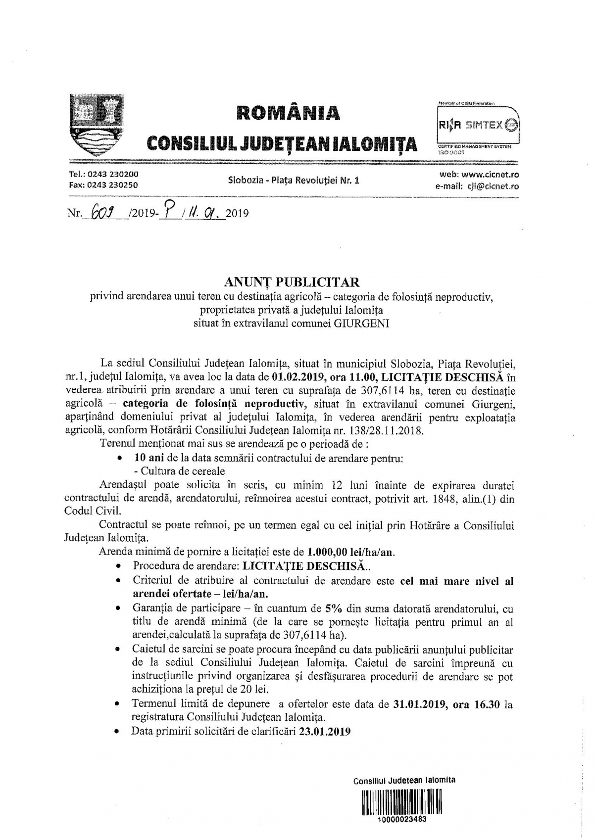 Anunț publicitar privind arendare teren cu destinație agricolă - categoria de folosință neproductiv - proprietatea privată a județului Ialomița situat in extravilanul comunei Giurgeni