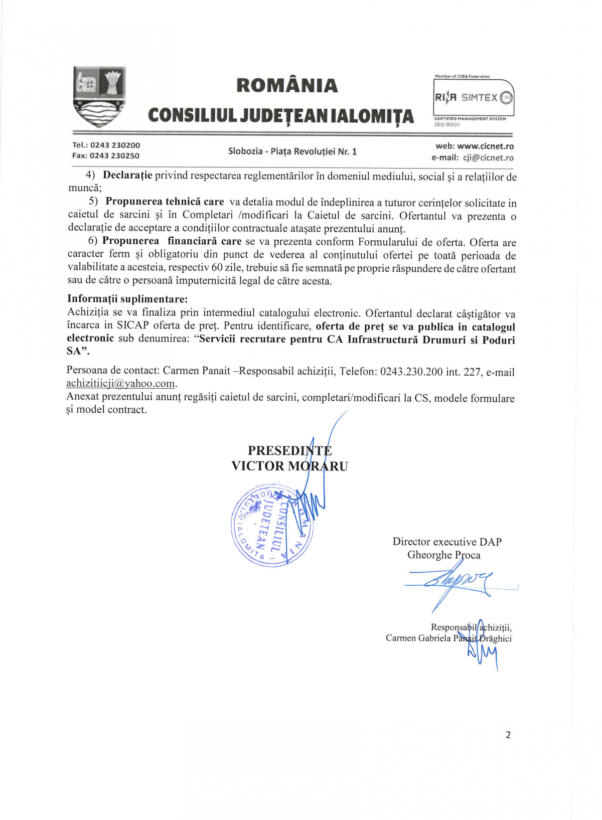 Prima pagină » Anunț achiziție directă Servicii de recrutare prestate de o firmă specializată care va efectua procedura de selecție a candidaților pentru ocuparea unui post vacant de administrator din cadrul C.A. al SC Infrastructură Drumuri și Poduri SA